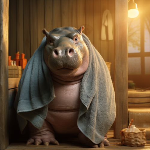 photorealistic hippo with a towel sitting in a finnish sauna looking happy into the camera
