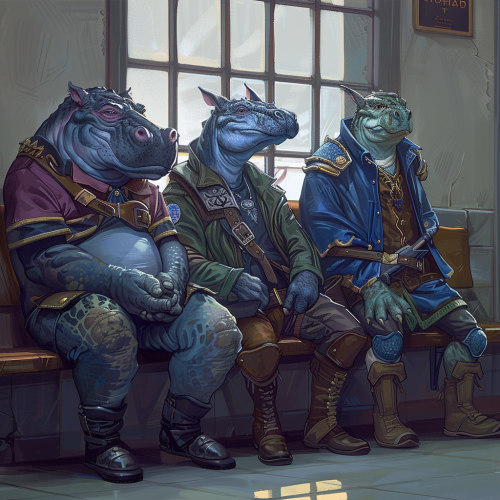 a hippo person wearing an admiral's uniform, a blue dragonkin wearing robes, a half-orc barbarian, and an elven druid sitting on a bench in a police station