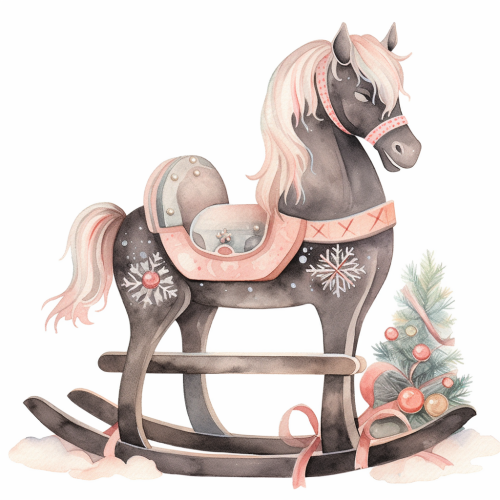 Christmas wooden rocking horse, velvet stone, in iron grey and beige and soft pink shade, watercolor, clipart --niji