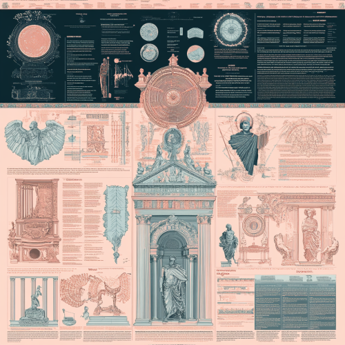 infographic about art cycles during the ages. The artwork features multiple panels that showcase detailed line work of different artists and cultures, scales, and other intricate details. Aesthetic combines classical serenity with dynamic data chaos, illustrating tradition meeting innovation. The page is filled with one main object and around it there are additional detailes about it. Colorful. Color palette pink and cyan --v 6.1 --style raw