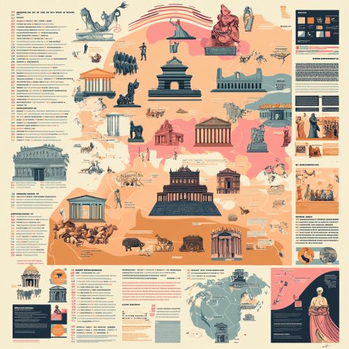 Illustrated map-like infographic highlighting the rise and fall of major civilizations (e.g., Ancient Greece, Roman Empire, Chinese dynasties), social/political movements (e.g., revolutions, reforms), and the evolution of cultural practices (e.g., art, music, literature), using a rich, historical color palette. Include stylized icons, timelines, and regional illustrations. The page is filled with one main object and additional details around it. Color palette of pink, orange and blue --v 6.1 --style raw