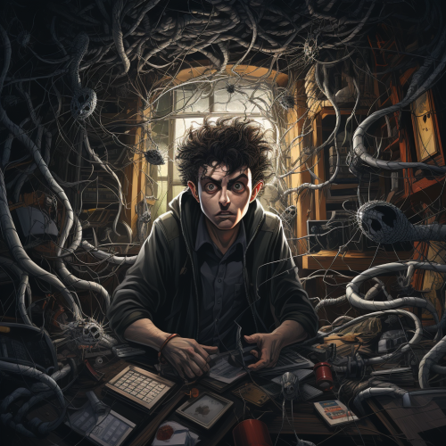 a robber in anxiety got tangled in a massive enormous spider's web, comic book style, cartoon --s 250