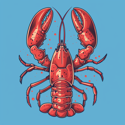 lobster lounging on a beach chair wearing a hat and a hawaiian print shirt. he grasps in one claw a sushi roll with a fish sticking out of it. lobster looks relaxed and contented.