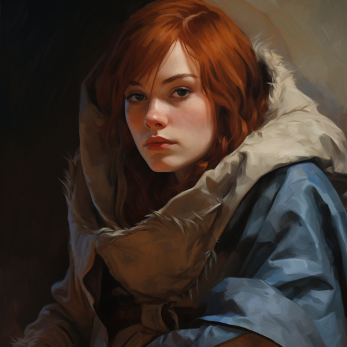 oil painting style illustration of a medieval fantasy female scout with auburn hair wearing leather armor and a cloak