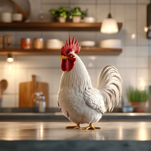 The image will feature a cartoon-style rooster with a prominent comb, set against a clean and simple kitchen island background. The three health benefits will be incorporated as blank spaces for easy editing.