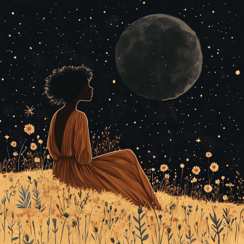 A tarot card style illustration of a black woman sitting on a hill under a black moon. The moon is dark. She is wearing a brown dress. There are flowers in the field around her.
