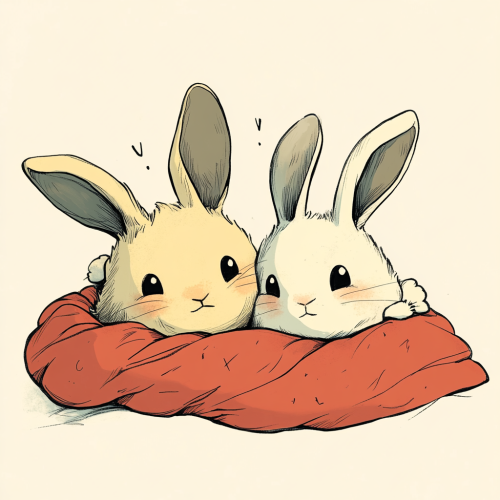Two cute cartoon bunnies lying on the blanket, illustrated by Sharpie, bold black lines and solid colors, simple details, minimalism, Sharpie illustration --s 250