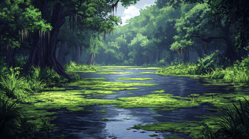Create a cartoon illustration of a dirty mire in the whimsical, exaggerated style reminiscent of the desert scenes from the Roadrunner cartoons. Emphasize the swampy mires, tangled vegetation, and eerie atmosphere, with exaggerated textures and colors to evoke a playful yet sinister vibe. Include humorous elements typical of classic cartoon landscapes, ensuring the illustration captures the essence of both the swamp's filthiness and the nostalgic cartoon aesthetic. --ar 16:9 --s 750 --v 6.1