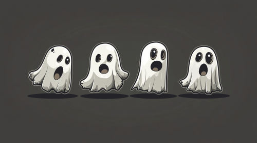 illustrated style, cute cartoon style ghosts. 2 ghosts in left corner, one ghost in the middle and 4th ghost on the right top corner. with a dark grey backdrop --ar 16:9