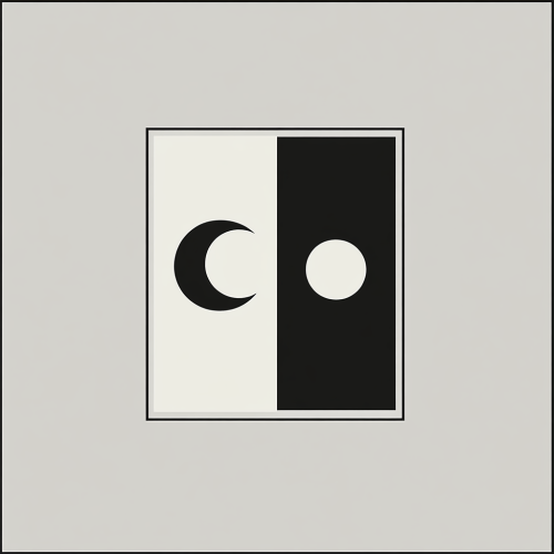 A minimalist graphic with sun and moon, the moon and the sun each are in a rectangle the sun is white and the rectangle is black, the moon is black and the rectangle is white , in a flat composition with no perspective or depth. , reminiscent of the minimalism style, evoking calmness and simplicity.