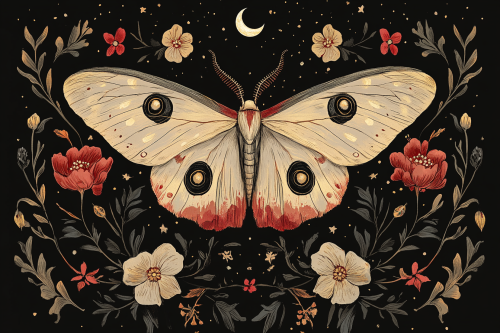Gothic illustration of a moon moth surrounded by flowers and vines, dark cottagecore style with pastel colors on a black background, floral accents, and a symmetrical design. --ar 3:2 --s 250