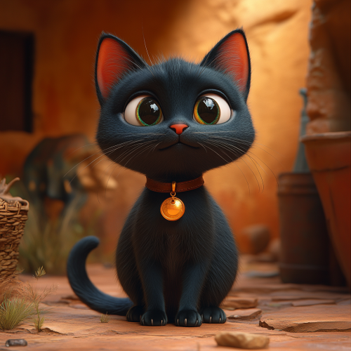 A mysterious black cat with a moon-shaped medallion, landing in prehistoric times, encountering dinosaurs, full body, 3D, Pixar style, cartoon. --s 750
