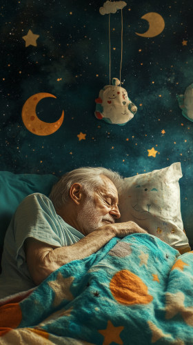 a wrinkled old man, receding grey hair sleeping deeply like a baby, with a mobile overhead, cartoon blanket draped over him, moon and stars stickers on the bedroom walls. --ar 9:16