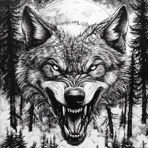 close up shot of a snarling wolf stalking forward through a forest with trees lining the skyline between its ears and a full moon, done as a hyper realistic pen and ink illustration in black and white