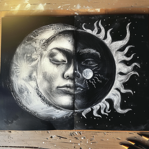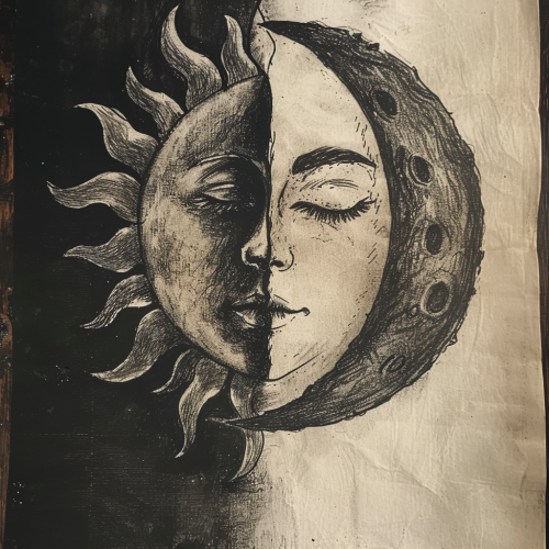 charcoal illustration of sun and moon, very simple, delicate, beautiful