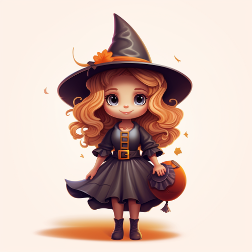 cartoon little witch, white background, in the style of 2d game art, flat brushwork, in the style of disney
