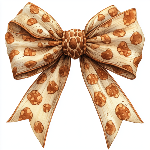A hand drawn watercolor style bow, intricately designed to resemble the pattern of giraffe spots. The bow is predominantly [brown with cream] style that mimics the giraffe spots . A grunge style giraffe print is on parts throughout the bow. It appears to be centrally positioned, with its ribbons spreading out symmetrically on a white background --v 6.1 --s 750