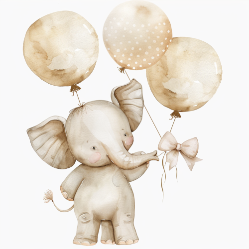 Cute baby elephant wearing a beige bow and holding dust beige and beige balloons, white background, watercolor, babyshower clipart, 8k, light beige white colors