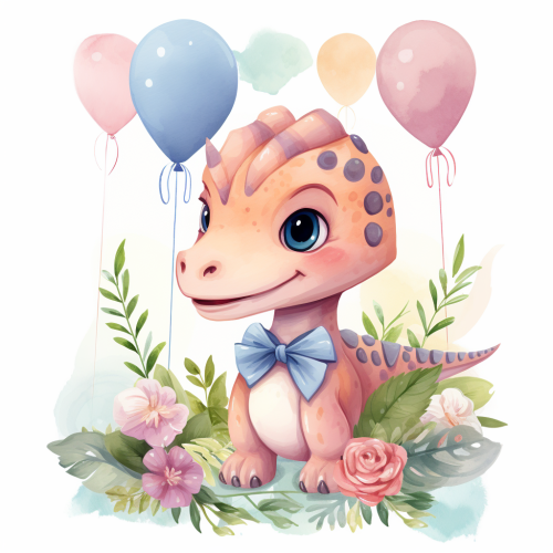 children’s birthday Invitation, template, no text, watercolor, female dinosaur wearing a bow with flowers and foliage, feminine colors, flat