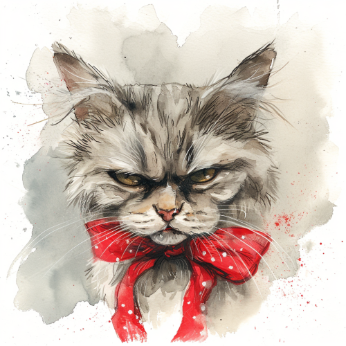 Watercolor illustration of cute cat with red bow, angry and attitude, in the style of appropriation artist, 32k uhd, light crimson and white, petcore, spirited portraits, womancore, avacadopunk --v 6.0