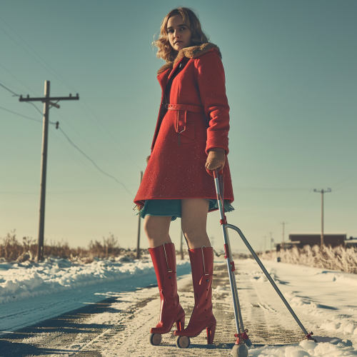 Kiernan shipka playing above knee amputee standing on two underarm crutches with only one leg hopping down icy road wearing one high heel boot and long winter coat,— no legs, feet, ankles, knees,--v 6.0
