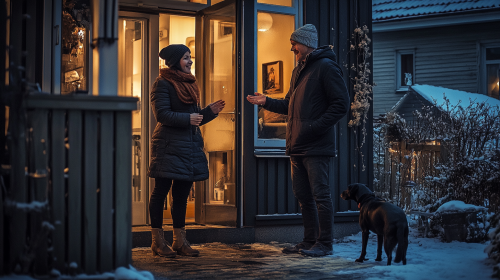 a smiling charming woman , dressed for winter, is standing outside on the sidewalk talking to a man that is standing with his black dog in his house with the front door open, cinematic style, photography, realism, great details, evening, Oslo, --ar 16:9 --v 6.1