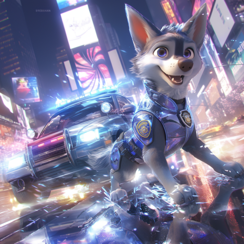 Chase of the canine patrol 3D drawing, disney, wearing a futuristic police uniform in blue and black with shiny metallic accents. He is in a heroic pose, with a focused and determined look, next to a police car with flashing lights. The background shows a modern city at night, with neon lights and high skyscrapers. The dog seems to be on the move, ready to act, with a touch of wind moving his uniform and creating a sense of urgency. --niji 6 --style raw --s 750