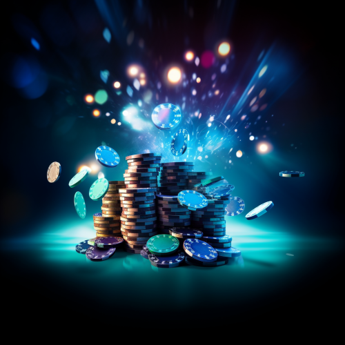 A 3D animated casino hall with a serious tone, showing four tables in green, yellow, red, and blue. Characters match the table colors, with a focus on the central blue table. The atmosphere is calm and controlled, with smooth lighting and steady camera work --ar 16:9 --v 6.1