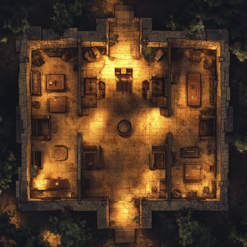 a birds eye view battle map for dungeons and dragons, the map is off an old castle office with wooden floors, a desk, an animal rug, and various bits that would be found in a castle are there