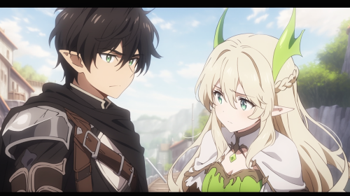 Shinichi Aizawa,a teenaged hero with slightly unruly black hair and blue eyes wearing medieval armor but no helmet walking down acountry lane. Walking with him and leaning against him romantically is Ai a green-skinned goblin girl with violet eyes and long straight white hair who is also wearing armor. in the style of Miyzaki’s CASTLE IN THE SKY anime. Vector graphic illustration,8k --ar 16:9 --niji 5
