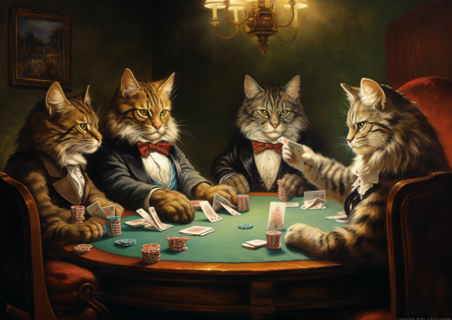 Cats playing poker in living room, Cassius Marcellus Coolidge style, light colors --ar 7:5