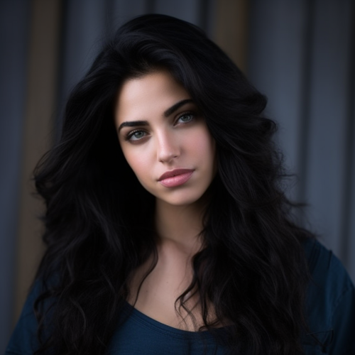 professionnal photoshoot gorgeous aesthetic model, big lips, dark long pretty curly hair middle part, blue eyes, black blazer, smiling softly, grey tone decorated room background, real skin, realistic person, realistic photo, zoom out