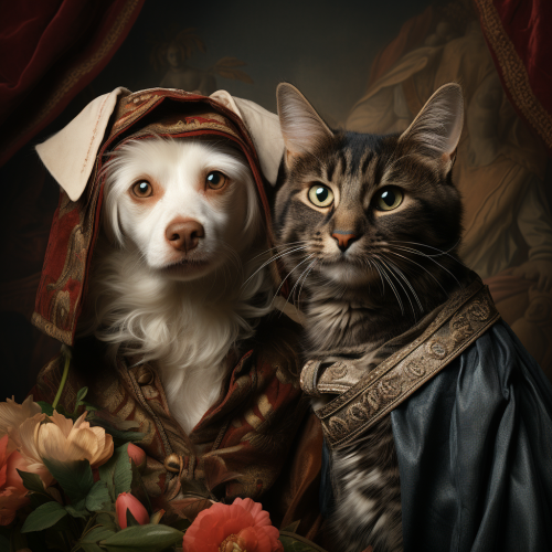 Cat and dog in a Renaissance-style portrait