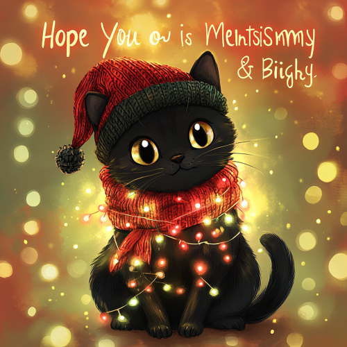 A cute black cat wearing a cozy knitted beanie and scarf, with twinkling Christmas lights wrapped around its body in a playful, festive way. The cat is sitting comfortably, with its eyes shining brightly, evoking a warm and cheerful holiday spirit. Above the cat’s head, in elegant and festive lettering, is the quote 'Hope your Christmas is meowy & bright'. The background should have soft, bokeh lights, evoking the glow of Christmas decorations, in shades of red, green, and gold, creating a joyful, holiday-themed atmosphere. The design should feel cozy, playful, and full of Christmas cheer.