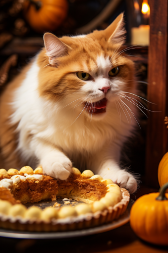 cat eating Pumpkin pie, christmas, realistic, captured by Canon EOS R camera, --aspect 6:9