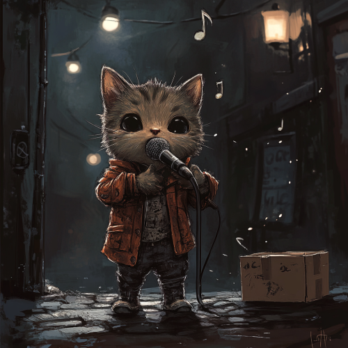 A chibi cat that looks very poor, skinny, and scruffy, singing into a worn-out microphone. The cat is dressed in tattered clothes, with patches and holes, standing on a shabby street corner. The background is dark and gritty, with dim streetlights and an old cardboard box as a stage. Despite the cat's rough appearance, it sings with passion, surrounded by a few floating musical notes in the cold night air. 4k, hdr, high quality