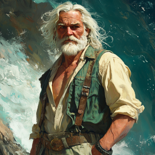 an old man, wavy white hair, tattered clothes, sea and sun touched skin, wearing a bright green blazier thats unbuttoned, no undershirt, overalls, and cowboyboots