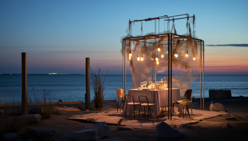 casual dinner by the sea, inspired by Salvador Dali and Wes Anderson, --c 22 --s 55 --style raw --ar 7:4