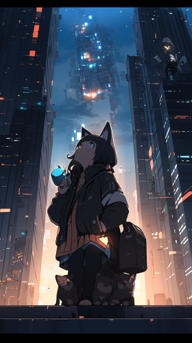 Cat girl with cat ears wearing headphones and standing on the platform, surrounded by high-rise buildings. He looked up at the sky, and there were many meteors passing by in the sky,the style of illustration,ultra-rich details, 8K quality --ar 9:16 --niji 5