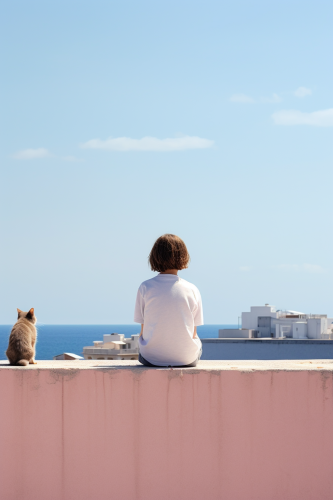 Anthropomorphic cat and anthropomorphic dog, wearing casual clothes and high-end wireless headphones, sitting in the center of a high-end high-end platform, 10 o'clock in the morning, looking at the sea view in the distance, with 2 cups of coffee next to them, high-end feel, rear view, 16k Image quality, --ar 16:9 --v 6.0