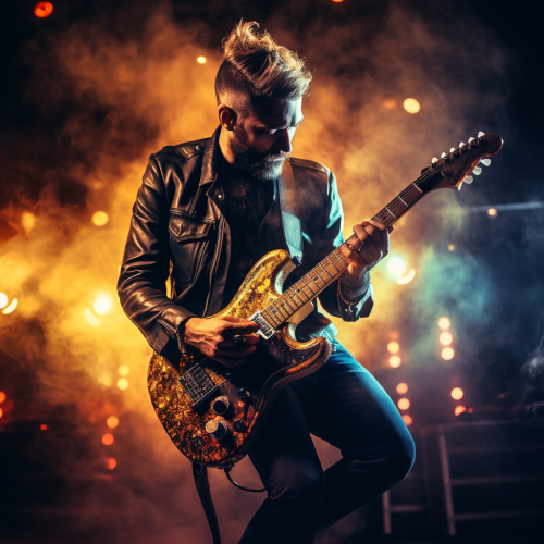 A comic book panel with a punk girl with colourful hair and lots of tattoos and piercings on stage playing a base guitar. She is on her knees really gettign into it, mouth open, screaming and hand in the air. We view her from underneath from the audience perspective. Comic book style full colour in the style of Alex Ross.