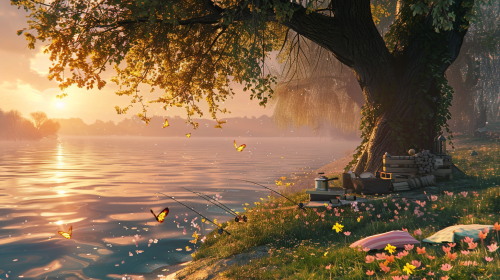 birch lake in western america, dawn, on the shore of the lake there is an oak tree and cozy picnic things are laid out, beautiful setting, butterflies are flying, there are flowers. Cast fishing rods are waiting for a bite of fish - unreal engine, 4k, high resolution, --ar 16:9 --v 6.0