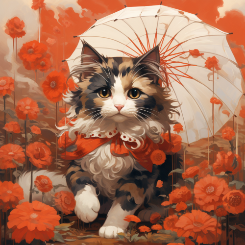 A fluffy calico cat carrying an umbrella walking through a field of poppies