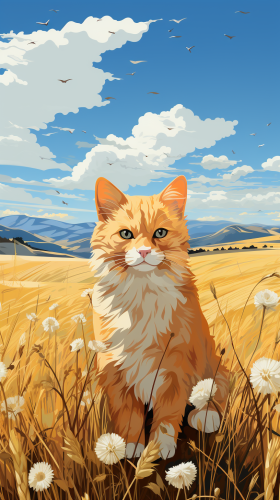 A ginger cat in a yellow wheat field, pure blue sky , minimal illustration, minimal illustration style,is in the style of Ryo Takemasa, bird's eye view, award winning illustration artwork, graphic, Japanese countryside, minimal art, Ryo Takemasa style, minimal poster, minimal composition, commonwealth magazine cover. 8k, --ar 9:16 --v 5.2 --s 750