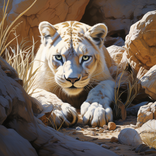 very white fur, panther, lioness like animal, is hiding while w hatching two hybrid creature of ocelot, cacomistle, coati, roam around desert