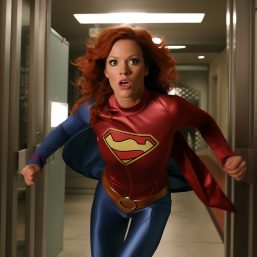 christina applegate as claire kent running through a building's revolving door at super speed transforming into superwoman in her iconic red and blue uniform in the 1978 movie realistic
