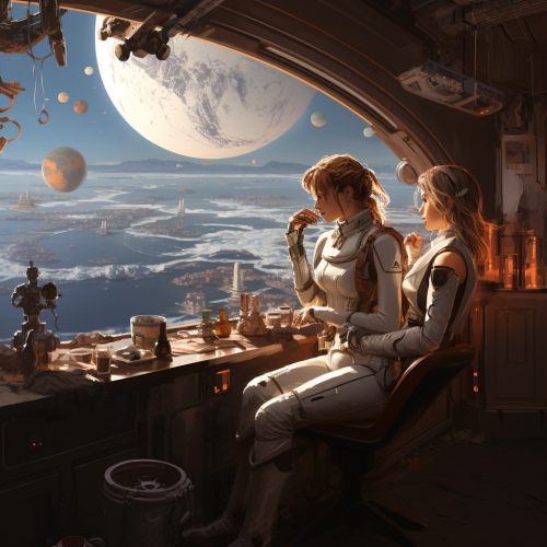 Concept art, Imperial mechanics drinking coffee, coffee break, some women, view from the window of an Imperial battleship, beautiful stars, Final Fantasy style, UE5