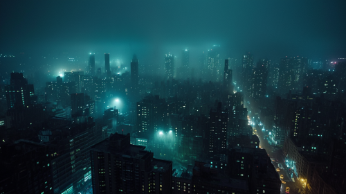 A solitary figure on a city rooftop at night, looking down at the street below, surrounded by a cold mist. The sky is overcast, reflecting city lights dimly. Cinematic style, capturing the isolation of urban loneliness with cool tones. --s 50 --style raw