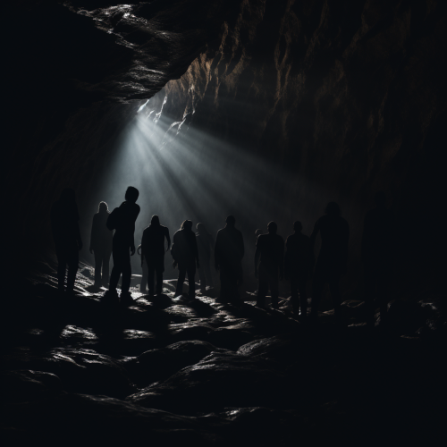 a painting of light rays shining through a cave. hyperrealistic. --ar 16:9