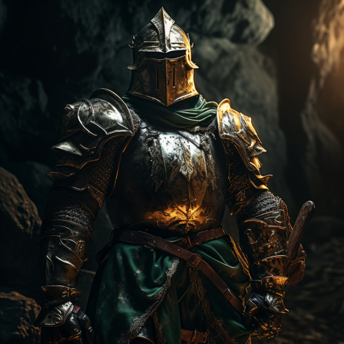 large knight in green-and-gold platemail, standing in a dimly-lit cave, photo-realistic, 8k